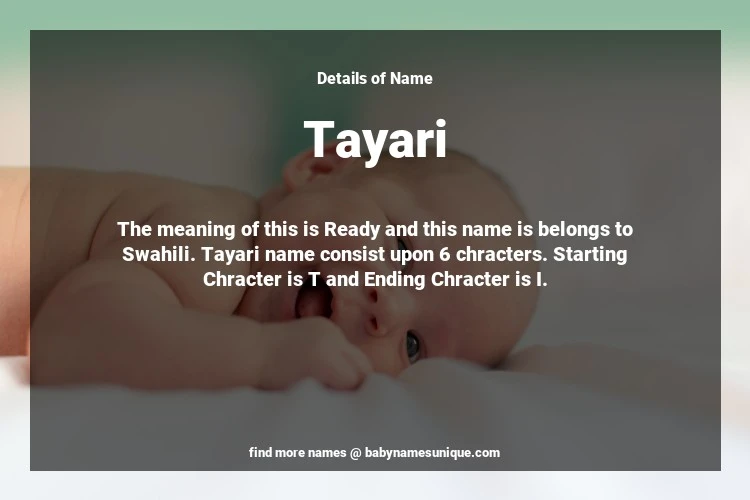 The name Tayari is chosen by those who are willing to find Unique Boy Baby Names. The meaning of this is Ready and this name is belongs to Swahili Origin. Baby Name Tayari consist upon 6 chracters. Starting alphabet is T and ending alphabet is I. This name is used primarily by parents who are considering unique baby names for Boy. The Zodiac Sign suitbale for this name are;