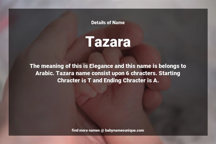 The name Tazara is chosen by those who are willing to find Unique Transgenders Baby Names. The meaning of this is Elegance and this name is belongs to Arabic Origin. Baby Name Tazara consist upon 6 chracters. Starting alphabet is T and ending alphabet is A. This name is used primarily by parents who are considering unique baby names for Transgenders. The Zodiac Sign suitbale for this name are;
