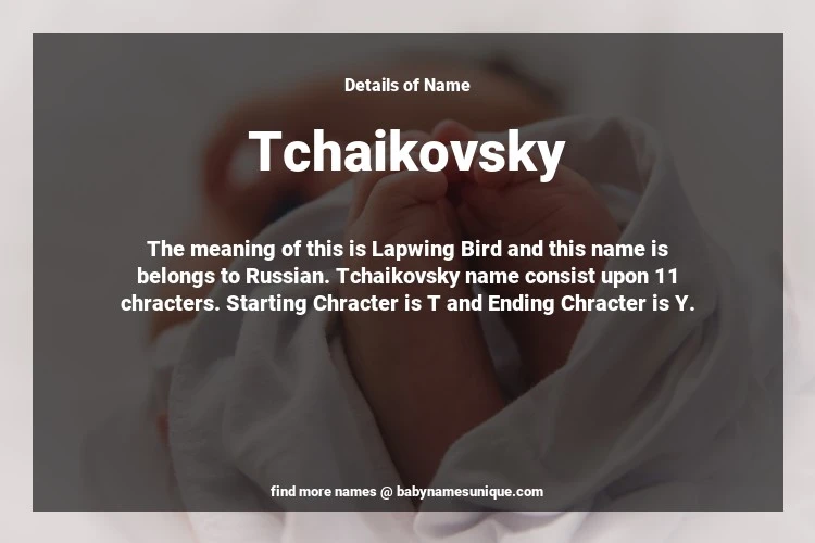 The name Tchaikovsky is chosen by those who are willing to find Unique Boy Baby Names. The meaning of this is Lapwing Bird and this name is belongs to Russian Origin. Baby Name Tchaikovsky consist upon 11 chracters. Starting alphabet is T and ending alphabet is Y. This name is used primarily by parents who are considering unique baby names for Boy. The Zodiac Sign suitbale for this name are;