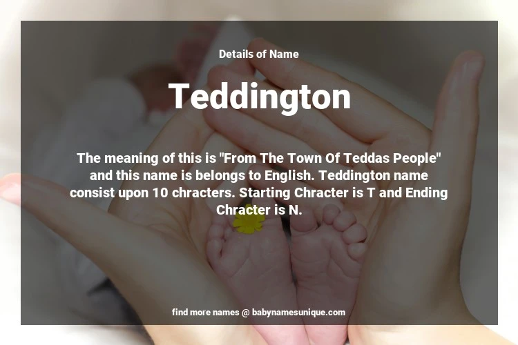 The name Teddington is chosen by those who are willing to find Unique Boy Baby Names. The meaning of this is "From The Town Of Teddas People" and this name is belongs to English Origin. Baby Name Teddington consist upon 10 chracters. Starting alphabet is T and ending alphabet is N. This name is used primarily by parents who are considering unique baby names for Boy. The Zodiac Sign suitbale for this name are;