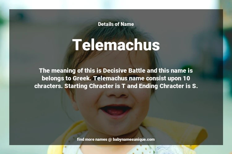 The name Telemachus is chosen by those who are willing to find Unique Boy Baby Names. The meaning of this is Decisive Battle and this name is belongs to Greek Origin. Baby Name Telemachus consist upon 10 chracters. Starting alphabet is T and ending alphabet is S. This name is used primarily by parents who are considering unique baby names for Boy. The Zodiac Sign suitbale for this name are;