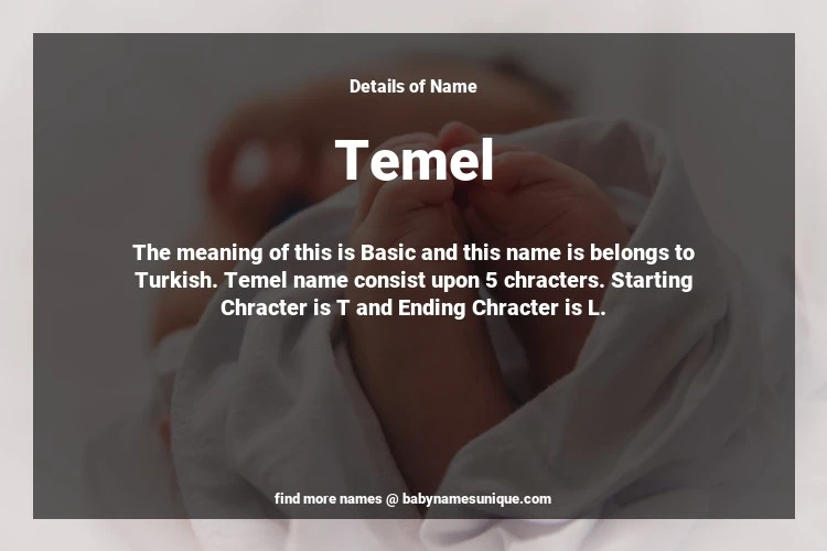 The name Temel is chosen by those who are willing to find Unique Boy Baby Names. The meaning of this is Basic and this name is belongs to Turkish Origin. Baby Name Temel consist upon 5 chracters. Starting alphabet is T and ending alphabet is L. This name is used primarily by parents who are considering unique baby names for Boy. The Zodiac Sign suitbale for this name are;