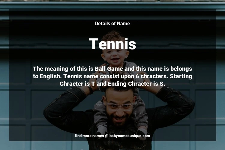 The name Tennis is chosen by those who are willing to find Unique Boy Baby Names. The meaning of this is Ball Game and this name is belongs to English Origin. Baby Name Tennis consist upon 6 chracters. Starting alphabet is T and ending alphabet is S. This name is used primarily by parents who are considering unique baby names for Boy. The Zodiac Sign suitbale for this name are;