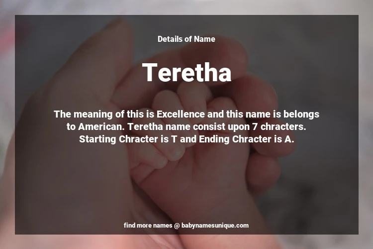 The name Teretha is chosen by those who are willing to find Unique Transgenders Baby Names. The meaning of this is Excellence and this name is belongs to American Origin. Baby Name Teretha consist upon 7 chracters. Starting alphabet is T and ending alphabet is A. This name is used primarily by parents who are considering unique baby names for Transgenders. The Zodiac Sign suitbale for this name are;