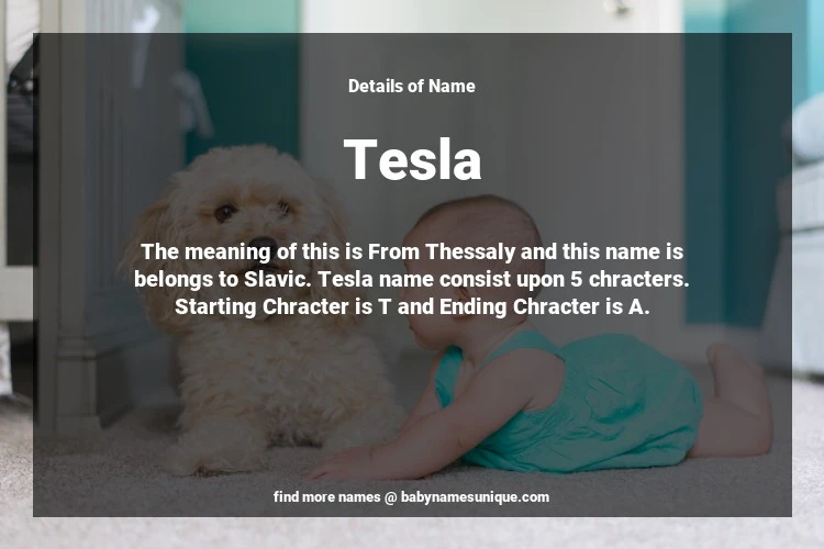 The name Tesla is chosen by those who are willing to find Unique Transgenders Baby Names. The meaning of this is From Thessaly and this name is belongs to Slavic Origin. Baby Name Tesla consist upon 5 chracters. Starting alphabet is T and ending alphabet is A. This name is used primarily by parents who are considering unique baby names for Transgenders. The Zodiac Sign suitbale for this name are;