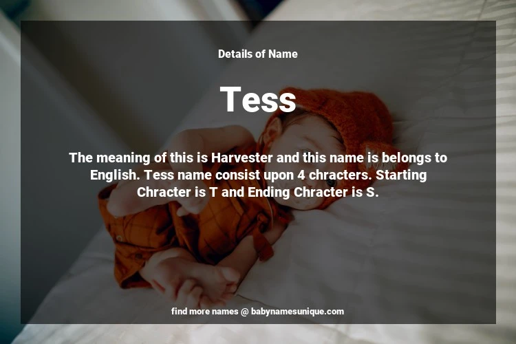 The name Tess is chosen by those who are willing to find Unique Transgenders Baby Names. The meaning of this is Harvester and this name is belongs to English Origin. Baby Name Tess consist upon 4 chracters. Starting alphabet is T and ending alphabet is S. This name is used primarily by parents who are considering unique baby names for Transgenders. The Zodiac Sign suitbale for this name are;