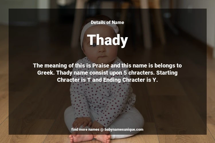The name Thady is chosen by those who are willing to find Unique Transgenders Baby Names. The meaning of this is Praise and this name is belongs to Greek Origin. Baby Name Thady consist upon 5 chracters. Starting alphabet is T and ending alphabet is Y. This name is used primarily by parents who are considering unique baby names for Transgenders. The Zodiac Sign suitbale for this name are;