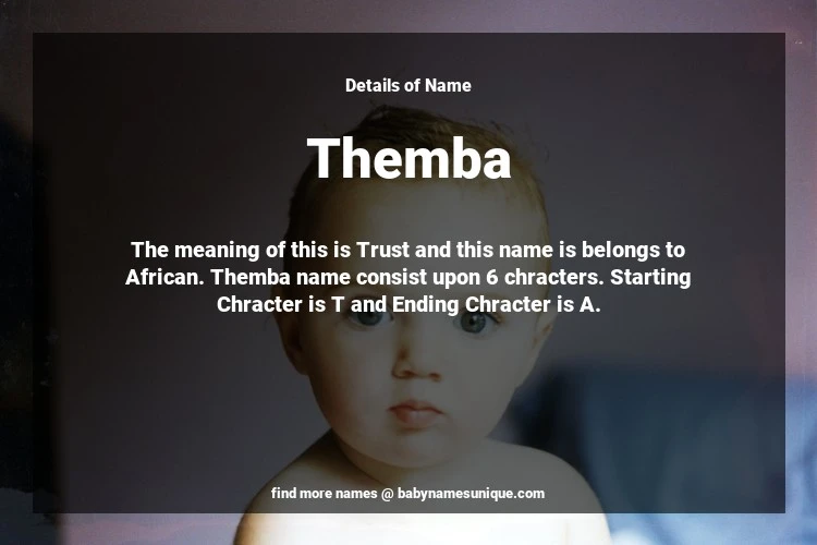 The name Themba is chosen by those who are willing to find Unique Transgenders Baby Names. The meaning of this is Trust and this name is belongs to African Origin. Baby Name Themba consist upon 6 chracters. Starting alphabet is T and ending alphabet is A. This name is used primarily by parents who are considering unique baby names for Transgenders. The Zodiac Sign suitbale for this name are;