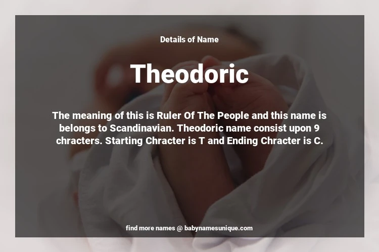 The name Theodoric is chosen by those who are willing to find Unique Boy Baby Names. The meaning of this is Ruler Of The People and this name is belongs to Scandinavian Origin. Baby Name Theodoric consist upon 9 chracters. Starting alphabet is T and ending alphabet is C. This name is used primarily by parents who are considering unique baby names for Boy. The Zodiac Sign suitbale for this name are;