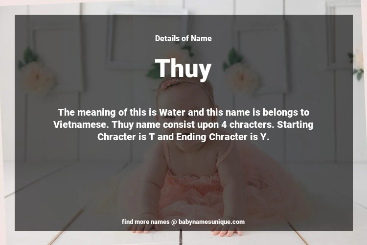 The name Thuy is chosen by those who are willing to find Unique Transgenders Baby Names. The meaning of this is Water and this name is belongs to Vietnamese Origin. Baby Name Thuy consist upon 4 chracters. Starting alphabet is T and ending alphabet is Y. This name is used primarily by parents who are considering unique baby names for Transgenders. The Zodiac Sign suitbale for this name are;