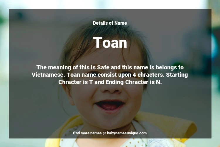 The name Toan is chosen by those who are willing to find Unique Transgenders Baby Names. The meaning of this is Safe and this name is belongs to Vietnamese Origin. Baby Name Toan consist upon 4 chracters. Starting alphabet is T and ending alphabet is N. This name is used primarily by parents who are considering unique baby names for Transgenders. The Zodiac Sign suitbale for this name are;