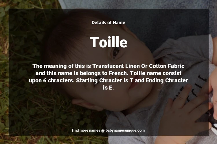 The name Toille is chosen by those who are willing to find Unique Transgenders Baby Names. The meaning of this is Translucent Linen Or Cotton Fabric and this name is belongs to French Origin. Baby Name Toille consist upon 6 chracters. Starting alphabet is T and ending alphabet is E. This name is used primarily by parents who are considering unique baby names for Transgenders. The Zodiac Sign suitbale for this name are;