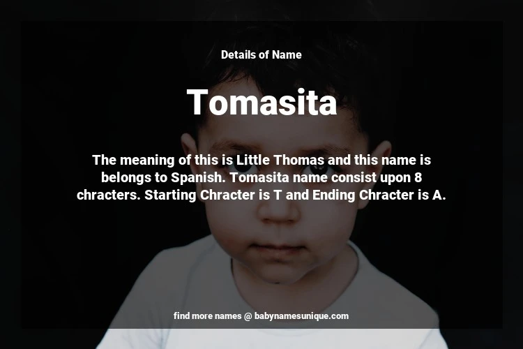 The name Tomasita is chosen by those who are willing to find Unique Transgenders Baby Names. The meaning of this is Little Thomas and this name is belongs to Spanish Origin. Baby Name Tomasita consist upon 8 chracters. Starting alphabet is T and ending alphabet is A. This name is used primarily by parents who are considering unique baby names for Transgenders. The Zodiac Sign suitbale for this name are;