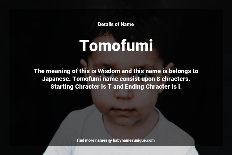 The name Tomofumi is chosen by those who are willing to find Unique Boy Baby Names. The meaning of this is Wisdom and this name is belongs to Japanese Origin. Baby Name Tomofumi consist upon 8 chracters. Starting alphabet is T and ending alphabet is I. This name is used primarily by parents who are considering unique baby names for Boy. The Zodiac Sign suitbale for this name are;