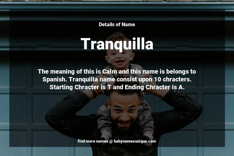 The name Tranquilla is chosen by those who are willing to find Unique Transgenders Baby Names. The meaning of this is Calm and this name is belongs to Spanish Origin. Baby Name Tranquilla consist upon 10 chracters. Starting alphabet is T and ending alphabet is A. This name is used primarily by parents who are considering unique baby names for Transgenders. The Zodiac Sign suitbale for this name are;