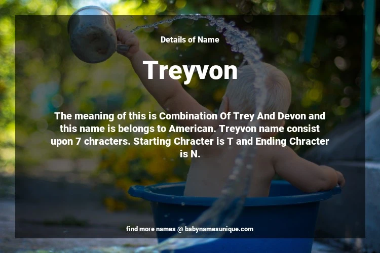 The name Treyvon is chosen by those who are willing to find Unique Boy Baby Names. The meaning of this is Combination Of Trey And Devon and this name is belongs to American Origin. Baby Name Treyvon consist upon 7 chracters. Starting alphabet is T and ending alphabet is N. This name is used primarily by parents who are considering unique baby names for Boy. The Zodiac Sign suitbale for this name are;