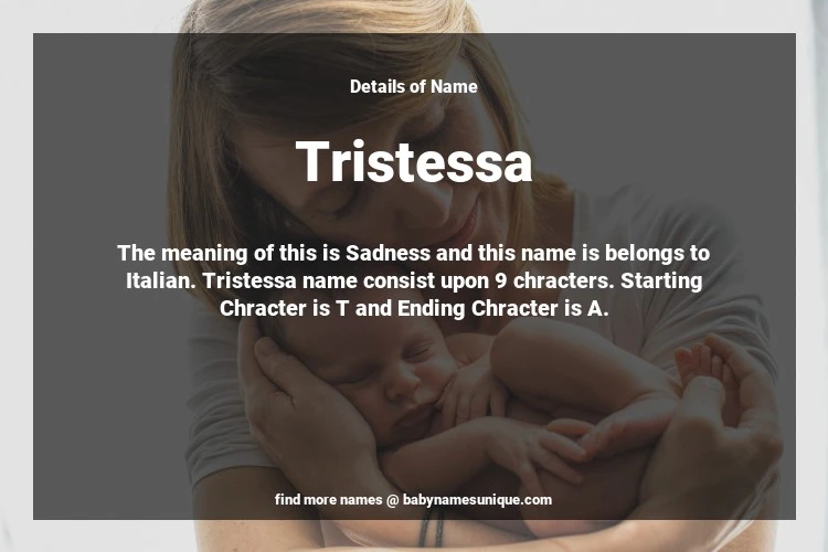 The name Tristessa is chosen by those who are willing to find Unique Transgenders Baby Names. The meaning of this is Sadness and this name is belongs to Italian Origin. Baby Name Tristessa consist upon 9 chracters. Starting alphabet is T and ending alphabet is A. This name is used primarily by parents who are considering unique baby names for Transgenders. The Zodiac Sign suitbale for this name are;