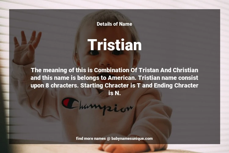 The name Tristian is chosen by those who are willing to find Unique Boy Baby Names. The meaning of this is Combination Of Tristan And Christian and this name is belongs to American Origin. Baby Name Tristian consist upon 8 chracters. Starting alphabet is T and ending alphabet is N. This name is used primarily by parents who are considering unique baby names for Boy. The Zodiac Sign suitbale for this name are;