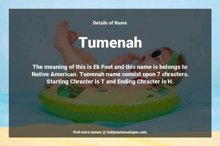 The name Tumenah is chosen by those who are willing to find Unique Boy Baby Names. The meaning of this is Ek Foot and this name is belongs to Native American Origin. Baby Name Tumenah consist upon 7 chracters. Starting alphabet is T and ending alphabet is H. This name is used primarily by parents who are considering unique baby names for Boy. The Zodiac Sign suitbale for this name are;