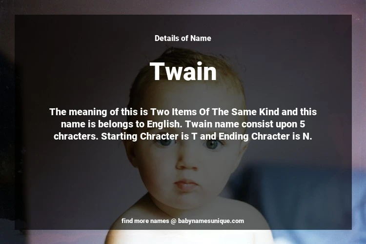 The name Twain is chosen by those who are willing to find Unique Transgenders Baby Names. The meaning of this is Two Items Of The Same Kind and this name is belongs to English Origin. Baby Name Twain consist upon 5 chracters. Starting alphabet is T and ending alphabet is N. This name is used primarily by parents who are considering unique baby names for Transgenders. The Zodiac Sign suitbale for this name are;