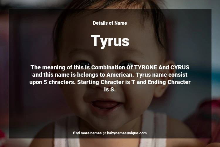 The name Tyrus is chosen by those who are willing to find Unique Boy Baby Names. The meaning of this is Combination Of TYRONE And CYRUS and this name is belongs to American Origin. Baby Name Tyrus consist upon 5 chracters. Starting alphabet is T and ending alphabet is S. This name is used primarily by parents who are considering unique baby names for Boy. The Zodiac Sign suitbale for this name are;