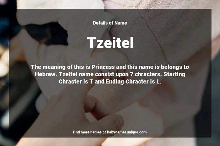 The name Tzeitel is chosen by those who are willing to find Unique Transgenders Baby Names. The meaning of this is Princess and this name is belongs to Hebrew Origin. Baby Name Tzeitel consist upon 7 chracters. Starting alphabet is T and ending alphabet is L. This name is used primarily by parents who are considering unique baby names for Transgenders. The Zodiac Sign suitbale for this name are;