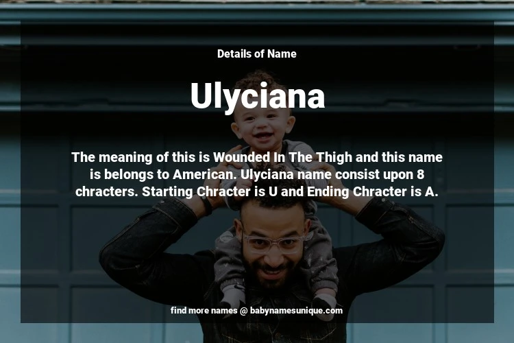 The name Ulyciana is chosen by those who are willing to find Unique Transgenders Baby Names. The meaning of this is Wounded In The Thigh and this name is belongs to American Origin. Baby Name Ulyciana consist upon 8 chracters. Starting alphabet is U and ending alphabet is A. This name is used primarily by parents who are considering unique baby names for Transgenders. The Zodiac Sign suitbale for this name are;
