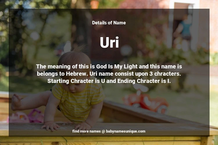 The name Uri is chosen by those who are willing to find Unique Boy Baby Names. The meaning of this is God Is My Light and this name is belongs to Hebrew Origin. Baby Name Uri consist upon 3 chracters. Starting alphabet is U and ending alphabet is I. This name is used primarily by parents who are considering unique baby names for Boy. The Zodiac Sign suitbale for this name are;