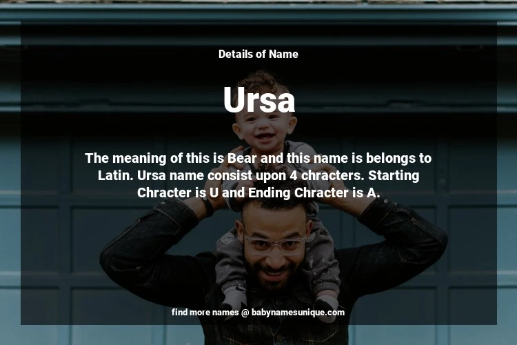 The name Ursa is chosen by those who are willing to find Unique Transgenders Baby Names. The meaning of this is Bear and this name is belongs to Latin Origin. Baby Name Ursa consist upon 4 chracters. Starting alphabet is U and ending alphabet is A. This name is used primarily by parents who are considering unique baby names for Transgenders. The Zodiac Sign suitbale for this name are;
