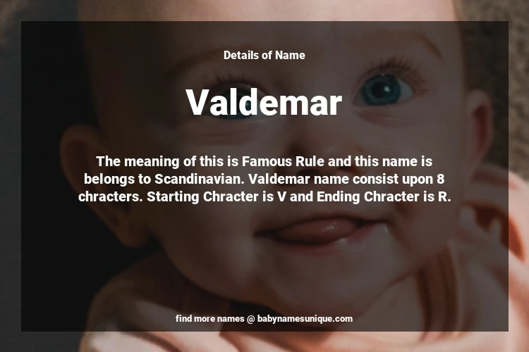 The name Valdemar is chosen by those who are willing to find Unique Boy Baby Names. The meaning of this is Famous Rule and this name is belongs to Scandinavian Origin. Baby Name Valdemar consist upon 8 chracters. Starting alphabet is V and ending alphabet is R. This name is used primarily by parents who are considering unique baby names for Boy. The Zodiac Sign suitbale for this name are;