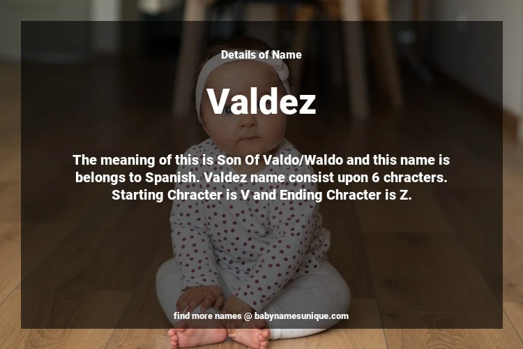 The name Valdez is chosen by those who are willing to find Unique Transgenders Baby Names. The meaning of this is Son Of Valdo/Waldo and this name is belongs to Spanish Origin. Baby Name Valdez consist upon 6 chracters. Starting alphabet is V and ending alphabet is Z. This name is used primarily by parents who are considering unique baby names for Transgenders. The Zodiac Sign suitbale for this name are;