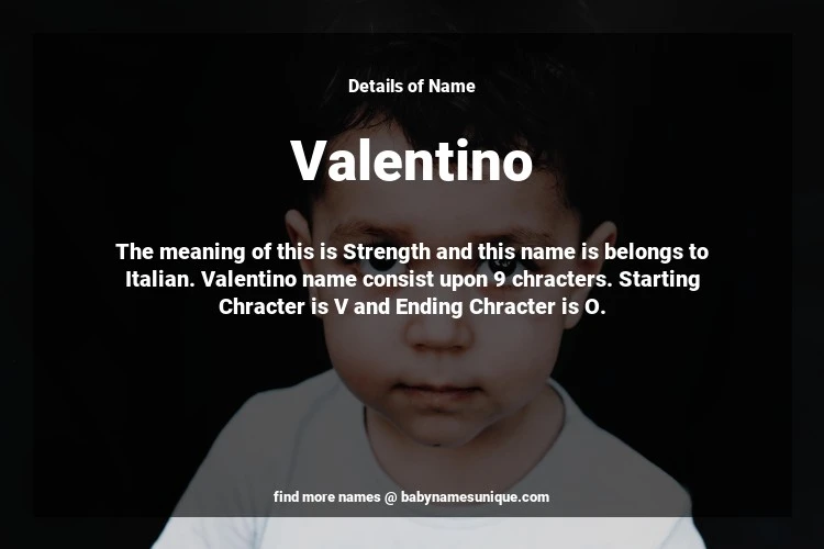 The name Valentino is chosen by those who are willing to find Unique Boy Baby Names. The meaning of this is Strength and this name is belongs to Italian Origin. Baby Name Valentino consist upon 9 chracters. Starting alphabet is V and ending alphabet is O. This name is used primarily by parents who are considering unique baby names for Boy. The Zodiac Sign suitbale for this name are;