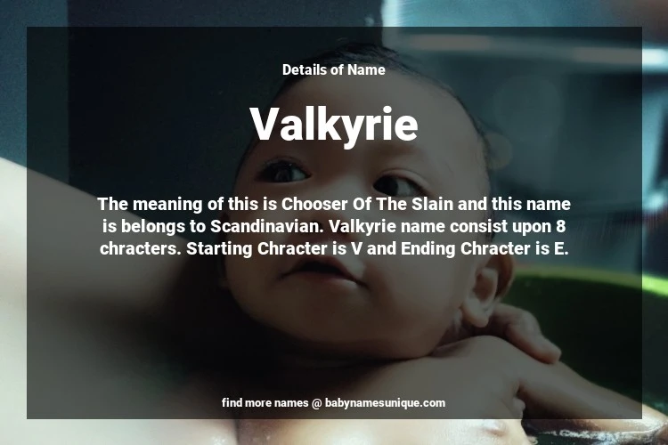 The name Valkyrie is chosen by those who are willing to find Unique Transgenders Baby Names. The meaning of this is Chooser Of The Slain and this name is belongs to Scandinavian Origin. Baby Name Valkyrie consist upon 8 chracters. Starting alphabet is V and ending alphabet is E. This name is used primarily by parents who are considering unique baby names for Transgenders. The Zodiac Sign suitbale for this name are;