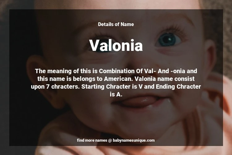 The name Valonia is chosen by those who are willing to find Unique Transgenders Baby Names. The meaning of this is Combination Of Val- And -onia and this name is belongs to American Origin. Baby Name Valonia consist upon 7 chracters. Starting alphabet is V and ending alphabet is A. This name is used primarily by parents who are considering unique baby names for Transgenders. The Zodiac Sign suitbale for this name are;