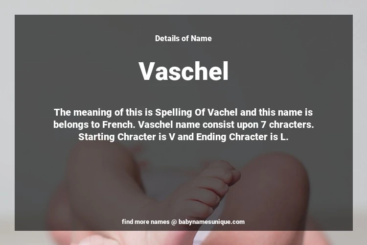 The name Vaschel is chosen by those who are willing to find Unique Boy Baby Names. The meaning of this is Spelling Of Vachel and this name is belongs to French Origin. Baby Name Vaschel consist upon 7 chracters. Starting alphabet is V and ending alphabet is L. This name is used primarily by parents who are considering unique baby names for Boy. The Zodiac Sign suitbale for this name are;