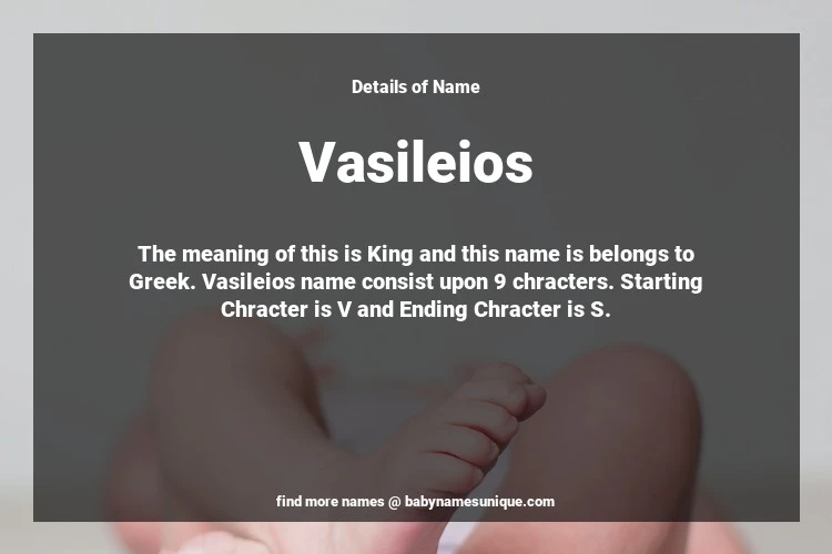 The name Vasileios is chosen by those who are willing to find Unique Boy Baby Names. The meaning of this is King and this name is belongs to Greek Origin. Baby Name Vasileios consist upon 9 chracters. Starting alphabet is V and ending alphabet is S. This name is used primarily by parents who are considering unique baby names for Boy. The Zodiac Sign suitbale for this name are;