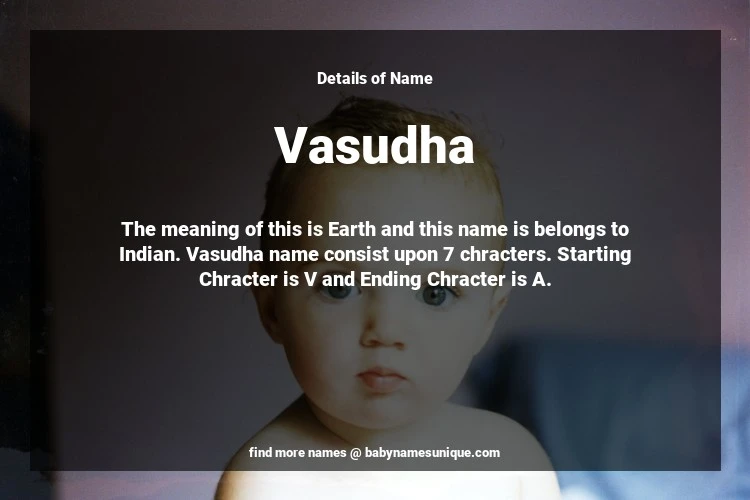 The name Vasudha is chosen by those who are willing to find Unique Transgenders Baby Names. The meaning of this is Earth and this name is belongs to Indian Origin. Baby Name Vasudha consist upon 7 chracters. Starting alphabet is V and ending alphabet is A. This name is used primarily by parents who are considering unique baby names for Transgenders. The Zodiac Sign suitbale for this name are;