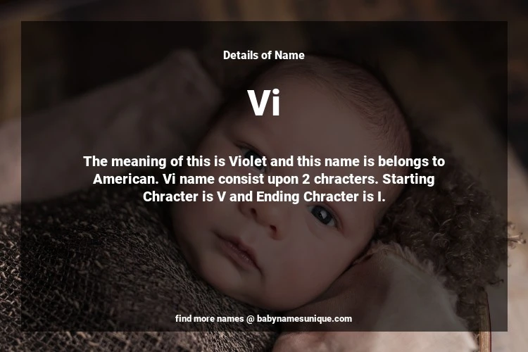 The name Vi is chosen by those who are willing to find Unique Transgenders Baby Names. The meaning of this is Violet and this name is belongs to American Origin. Baby Name Vi consist upon 2 chracters. Starting alphabet is V and ending alphabet is I. This name is used primarily by parents who are considering unique baby names for Transgenders. The Zodiac Sign suitbale for this name are;