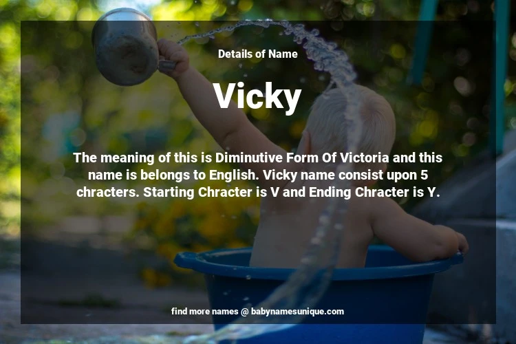 The name Vicky is chosen by those who are willing to find Unique Transgenders Baby Names. The meaning of this is Diminutive Form Of Victoria and this name is belongs to English Origin. Baby Name Vicky consist upon 5 chracters. Starting alphabet is V and ending alphabet is Y. This name is used primarily by parents who are considering unique baby names for Transgenders. The Zodiac Sign suitbale for this name are;