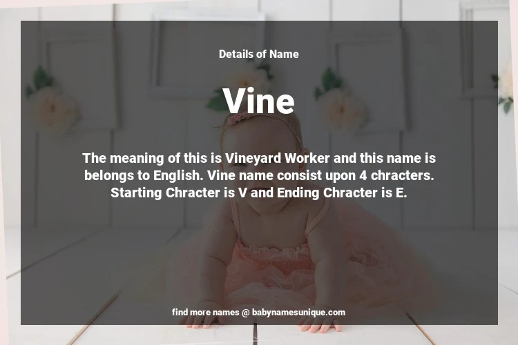 The name Vine is chosen by those who are willing to find Unique Transgenders Baby Names. The meaning of this is Vineyard Worker and this name is belongs to English Origin. Baby Name Vine consist upon 4 chracters. Starting alphabet is V and ending alphabet is E. This name is used primarily by parents who are considering unique baby names for Transgenders. The Zodiac Sign suitbale for this name are;
