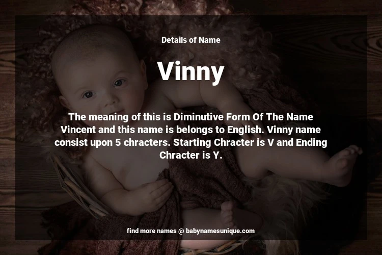 The name Vinny is chosen by those who are willing to find Unique Boy Baby Names. The meaning of this is Diminutive Form Of The Name Vincent and this name is belongs to English Origin. Baby Name Vinny consist upon 5 chracters. Starting alphabet is V and ending alphabet is Y. This name is used primarily by parents who are considering unique baby names for Boy. The Zodiac Sign suitbale for this name are;