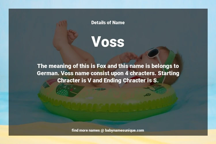 The name Voss is chosen by those who are willing to find Unique Transgenders Baby Names. The meaning of this is Fox and this name is belongs to German Origin. Baby Name Voss consist upon 4 chracters. Starting alphabet is V and ending alphabet is S. This name is used primarily by parents who are considering unique baby names for Transgenders. The Zodiac Sign suitbale for this name are;