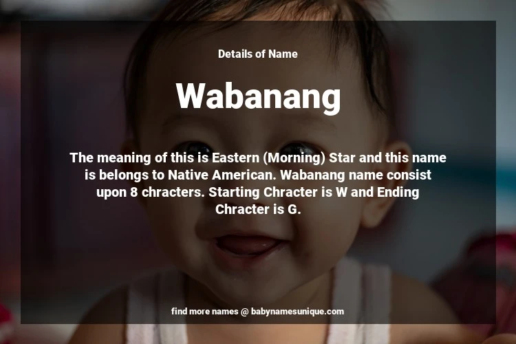 The name Wabanang is chosen by those who are willing to find Unique Transgenders Baby Names. The meaning of this is Eastern (Morning) Star and this name is belongs to Native American Origin. Baby Name Wabanang consist upon 8 chracters. Starting alphabet is W and ending alphabet is G. This name is used primarily by parents who are considering unique baby names for Transgenders. The Zodiac Sign suitbale for this name are;