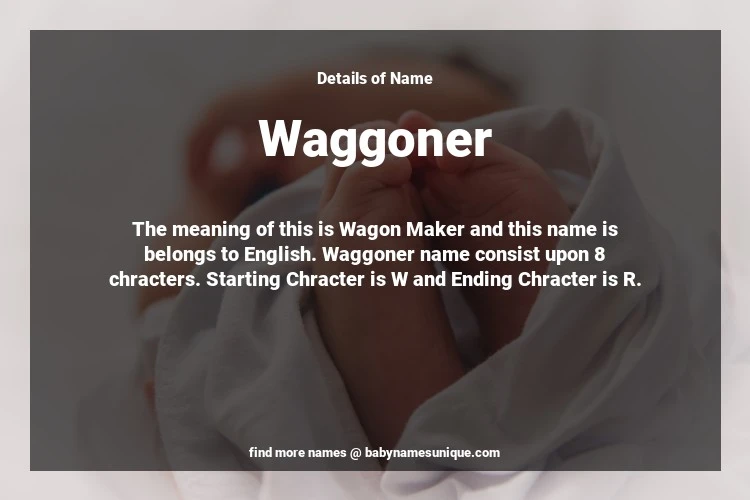 The name Waggoner is chosen by those who are willing to find Unique Boy Baby Names. The meaning of this is Wagon Maker and this name is belongs to English Origin. Baby Name Waggoner consist upon 8 chracters. Starting alphabet is W and ending alphabet is R. This name is used primarily by parents who are considering unique baby names for Boy. The Zodiac Sign suitbale for this name are;