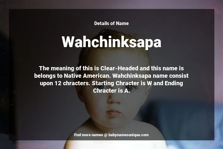 The name Wahchinksapa is chosen by those who are willing to find Unique Boy Baby Names. The meaning of this is Clear-Headed and this name is belongs to Native American Origin. Baby Name Wahchinksapa consist upon 12 chracters. Starting alphabet is W and ending alphabet is A. This name is used primarily by parents who are considering unique baby names for Boy. The Zodiac Sign suitbale for this name are;