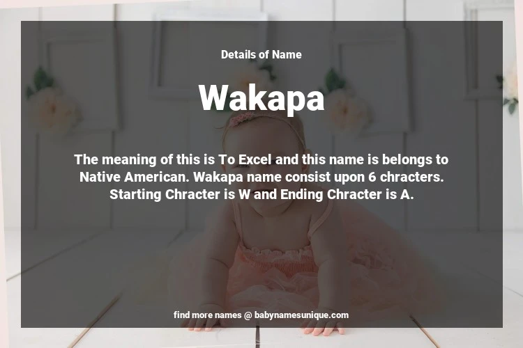 The name Wakapa is chosen by those who are willing to find Unique Transgenders Baby Names. The meaning of this is To Excel and this name is belongs to Native American Origin. Baby Name Wakapa consist upon 6 chracters. Starting alphabet is W and ending alphabet is A. This name is used primarily by parents who are considering unique baby names for Transgenders. The Zodiac Sign suitbale for this name are;