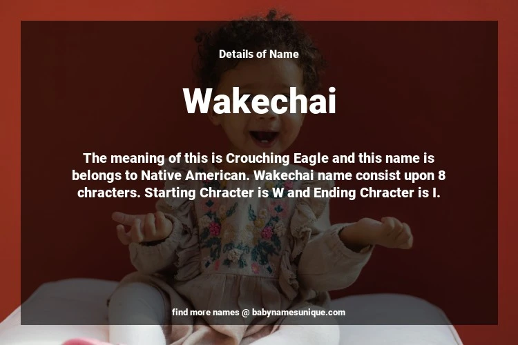 The name Wakechai is chosen by those who are willing to find Unique Transgenders Baby Names. The meaning of this is Crouching Eagle and this name is belongs to Native American Origin. Baby Name Wakechai consist upon 8 chracters. Starting alphabet is W and ending alphabet is I. This name is used primarily by parents who are considering unique baby names for Transgenders. The Zodiac Sign suitbale for this name are;