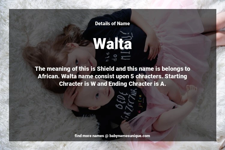 The name Walta is chosen by those who are willing to find Unique Transgenders Baby Names. The meaning of this is Shield and this name is belongs to African Origin. Baby Name Walta consist upon 5 chracters. Starting alphabet is W and ending alphabet is A. This name is used primarily by parents who are considering unique baby names for Transgenders. The Zodiac Sign suitbale for this name are;