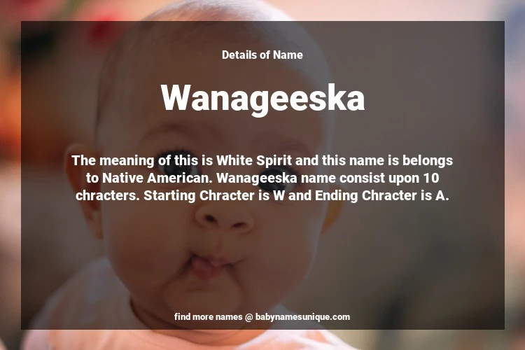 The name Wanageeska is chosen by those who are willing to find Unique Boy Baby Names. The meaning of this is White Spirit and this name is belongs to Native American Origin. Baby Name Wanageeska consist upon 10 chracters. Starting alphabet is W and ending alphabet is A. This name is used primarily by parents who are considering unique baby names for Boy. The Zodiac Sign suitbale for this name are;