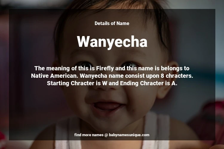 The name Wanyecha is chosen by those who are willing to find Unique Transgenders Baby Names. The meaning of this is Firefly and this name is belongs to Native American Origin. Baby Name Wanyecha consist upon 8 chracters. Starting alphabet is W and ending alphabet is A. This name is used primarily by parents who are considering unique baby names for Transgenders. The Zodiac Sign suitbale for this name are;